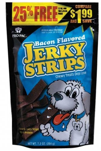 Dogs get excited about the savory flavor of bacon in PRO PAC Bacon Flavored Jerky Strips. PRO PAC Bacon Flavored Jerky Strips treats are a delicious way to reward or help train your dog. Packed in a convenient, resealable zip pouch to seal in the freshness and flavor.